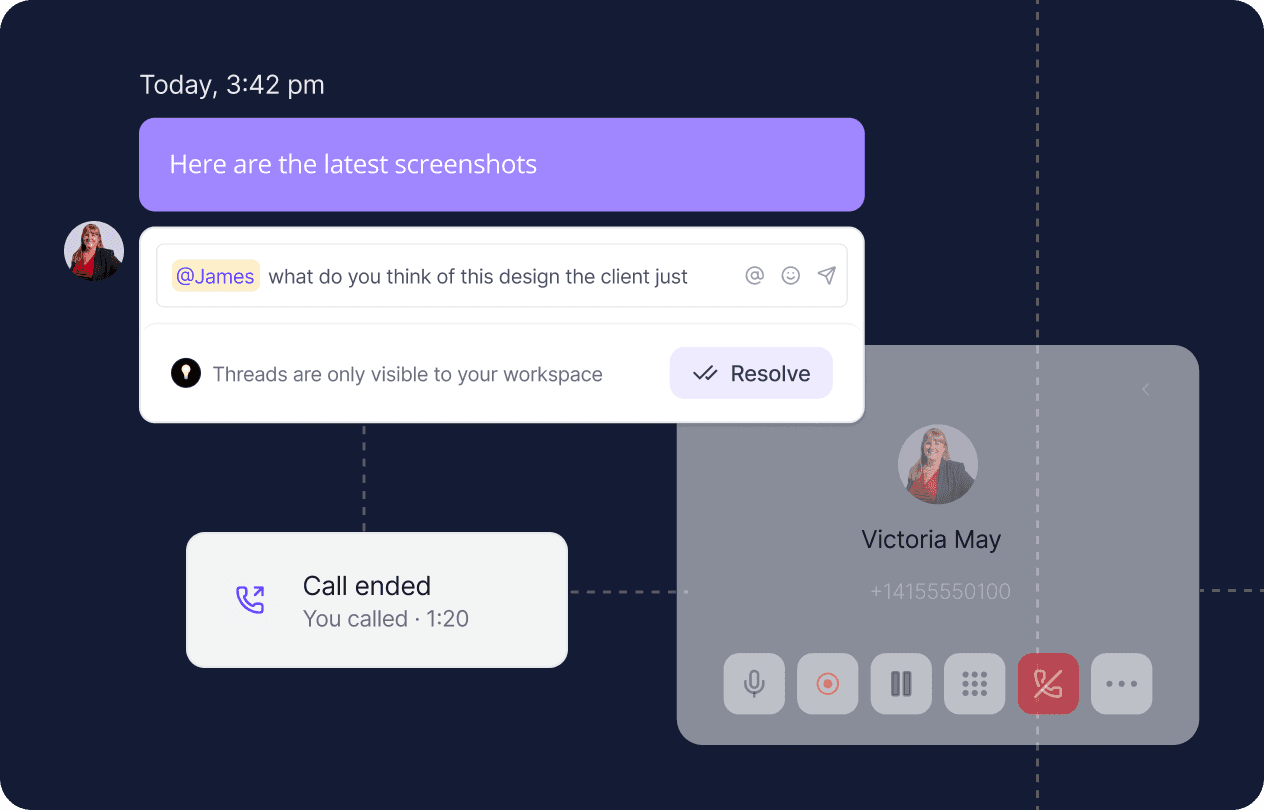 Keep team chat and quick huddles right next to the customer conversation. No side channels.